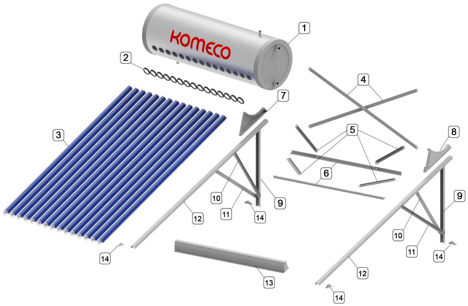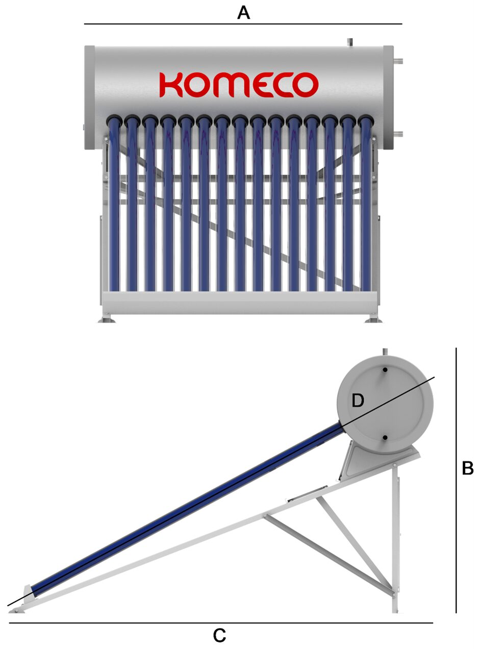 | Modelo 20 Tubos | Volume: 169L | Produção: 207,5 kWh/mês |
